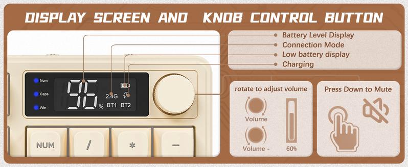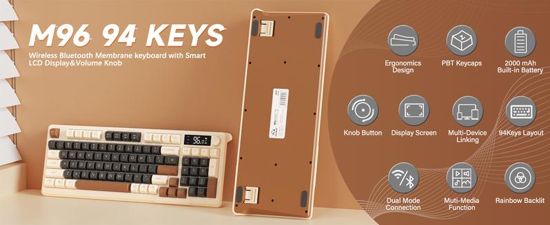 Elevate your typing experience with the M96 Wireless Keyboard. It boasts a creamy silent membrane for smooth operation. The keyboard includes a rainbow backlight and a media knob for easy navigation. An LCD screen adds extra functionality. Available in dual mode—Bluetooth/2.4Ghz—it suits various needs. Perfect for Win, Mac, and PC gamers.